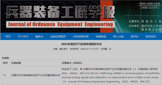 20级兵器科学与技术学科硕士生牧迪在《兵器装备工程学报》期刊发表的论文—“光幕阵列多维度模拟信号产生及测量误差校准”,近日经优选后被收录进《兵器装备工程学报》2023年度信号与信息处理虚拟专刊。该论文主要阐述了一种多维度模拟信号产生方法可实现对弹丸多个飞行参数测量结果进行有效的校准,该方法可使校准误差小于1mm,且在校准精度、实验效率、安全性、运行成本等方面具有优势。2023年度信号与信息处理虚拟专刊网址://bzxb.cqut.edu.cn/newsinfo.aspx?id=1458
