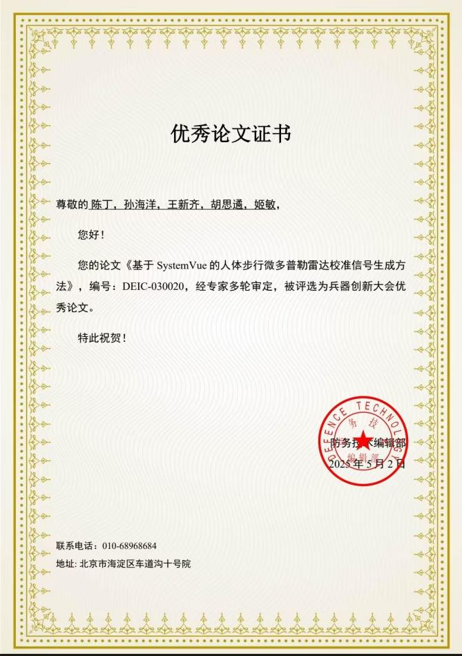 23级兵器科学与技术学科硕士研究生孙海洋(第二作者兼通讯作者)撰写的《基于SystemVue的人体步行微多普勒雷达校准信号生成方法》,被评选为兵器创新大会优秀论文。