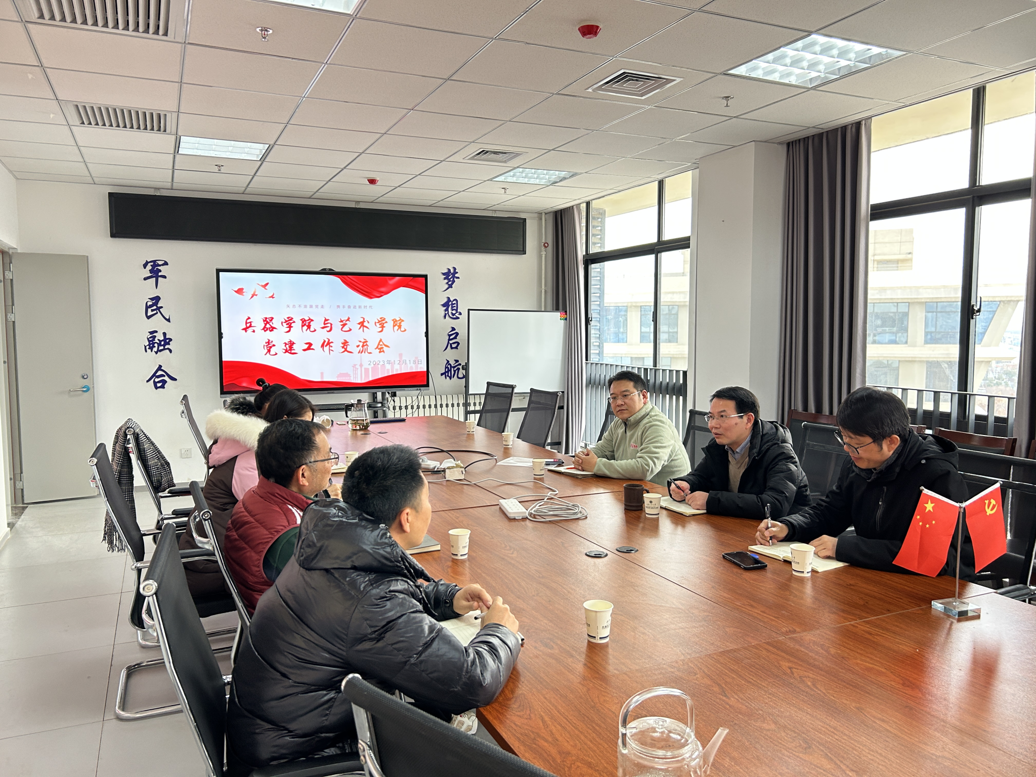2023年12月18日下午2:30分,51吃瓜网 党委书记蔡长龙、党委组织委员陈丁、辅导员王国栋与来访的艺术与传媒51吃瓜网 党委书记周著一行四人与在51吃瓜网 8-615会议开展两院党建工作交流。