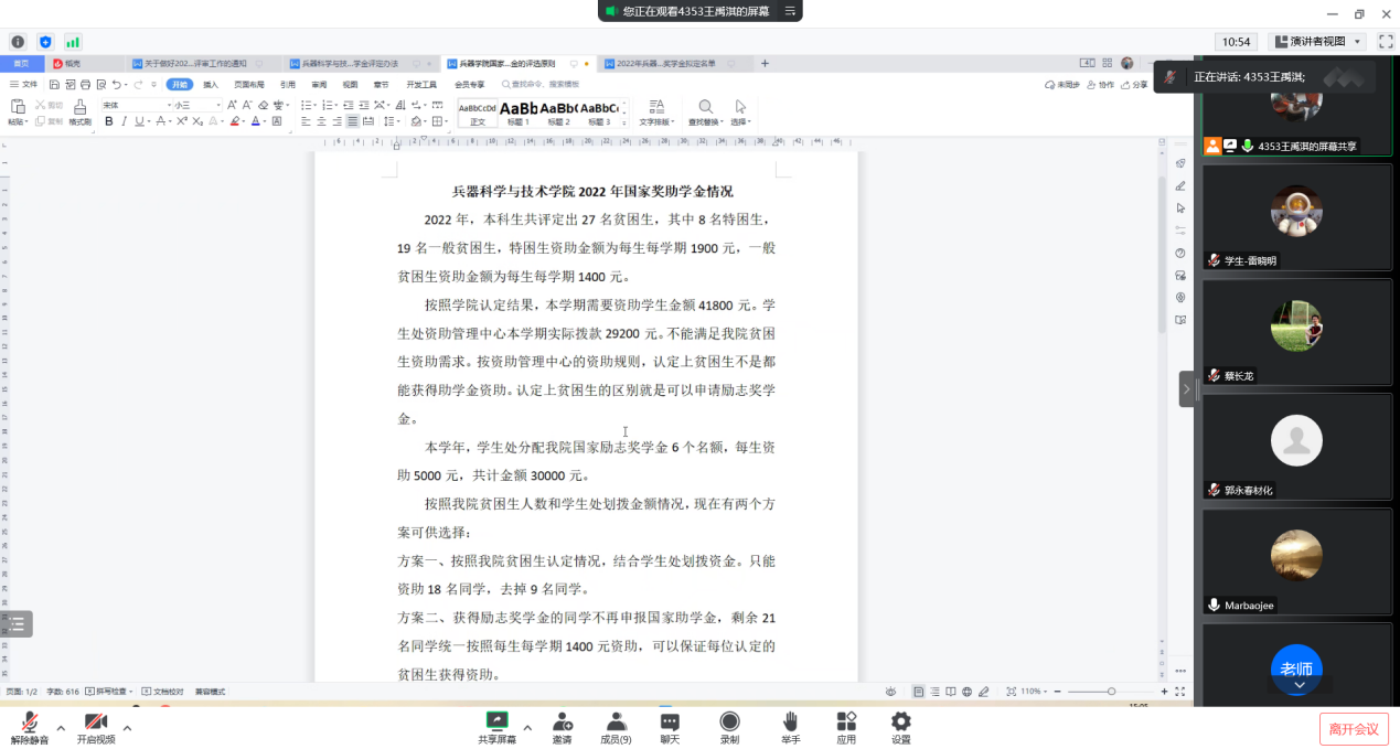 奖助委员线上会议,研究并讨论本科生国家助学金和国家奖学金评审原则、普瑞斯企业奖学金评定办法。评审委员会成员马保吉、郭永春、蔡长龙、王春阳、吴杰、霍文俊参与了评审委员会。辅导员王国栋,本科生研究生各一名代表参加了会议,会议由党委书记马保吉主持。