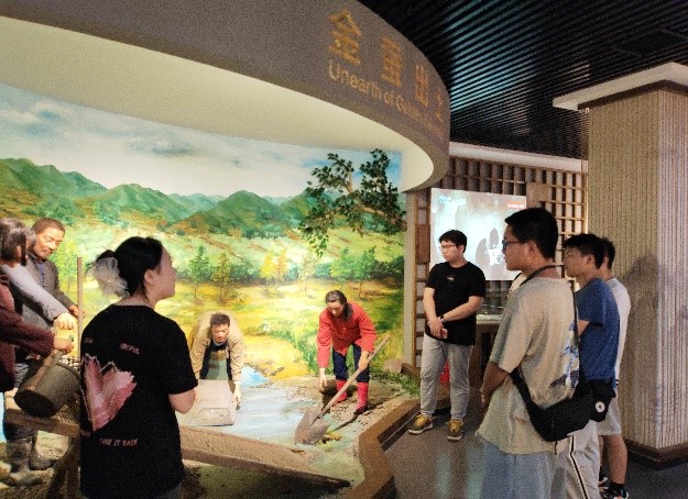 首站,实践队一行踏入了“金蚕小镇“展览馆,仿佛穿越千年时光隧道,聆听丝绸之路上的悠悠驼铃声,感受池河镇作为古代丝绸之路重要节点的辉煌过往。在解说员声情并茂的讲述下,队员们不仅了解了金蚕发现的传奇故事,更深刻体会到了“金蚕小镇”深厚的历史文化底蕴和独特的文化魅力。